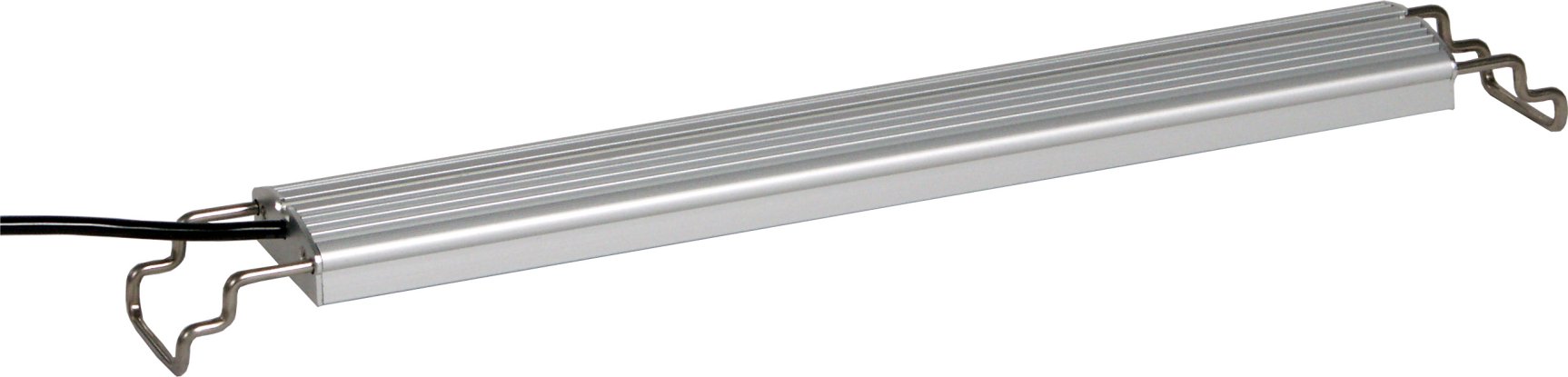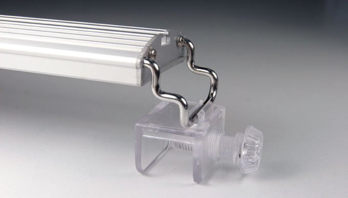 The Arcadia STRETCH LED lamp combines innovation with a functional design. This is a very low profile LED unit that extends to fit over various lengths of aquarium making it one of the most flexible units. The LED lamp can be fixed on th aquarium frame with its variable holding clamps. It is also possible to use the included glass holder to mount the Arcadia STRETCH LED directly on the aquarium glass. With the optional wire set the LED lamp can be used as hanging lamp over the aquarium. The dual light mode of the power supply recreates daylight and moonlight conditions for a more natural day cycle.