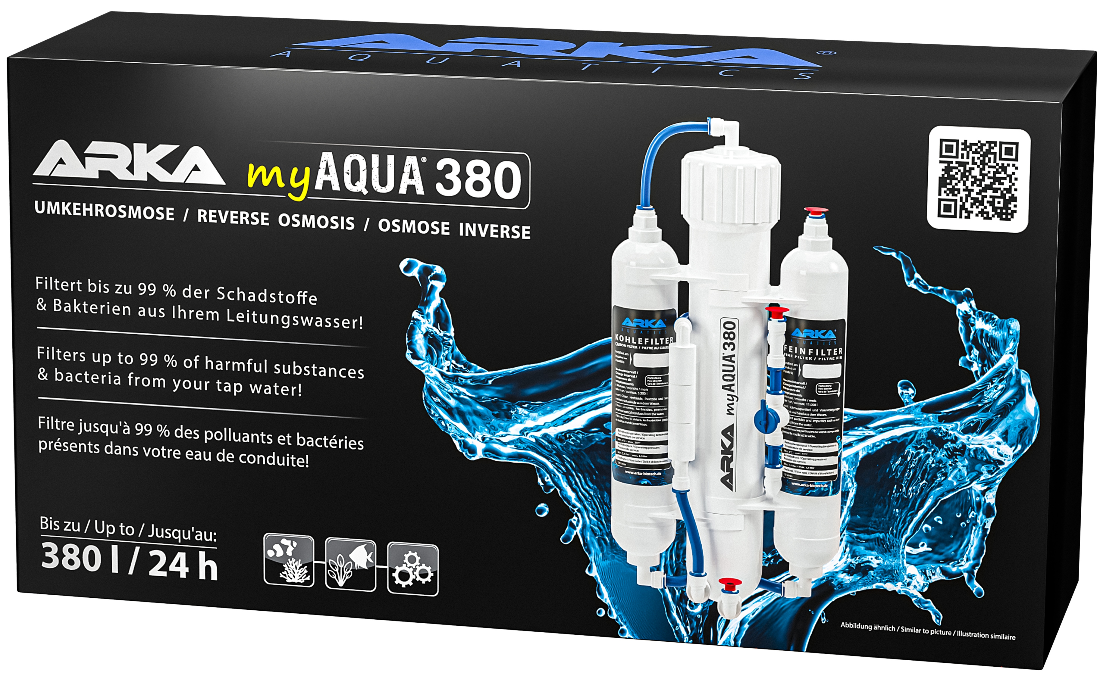 - Q: For which aquariums is the Arka myAqua 380 suitable? A: For freshwater and saltwater aquariums - as a basis for producing osmosis water. Q: What does the reverse osmosis system remove from tap water? A: According to the manufacturer, it filters up to 99% of salts, bacteria, and pollutants (e.g., nitrate, phosphate, and heavy metals are mentioned as examples). Q: Does the system require electricity? A: No. It does not require electricity and operates solely on water pressure. Q: How much osmosis water does the myAqua 380 produce per day? A: Up to 190 liters of osmosis water/day (depending on conditions). Q: What is the ratio of osmosis water to residual water? A: The yield is approximately 1:3-4 (osmosis water:residual water). Q: How big is the system? A: Approx. 35 × 19 × 10 cm. Q: What is included in the scope of delivery? A: Membrane + membrane housing, fine filter cartridge, carbon filter cartridge, membrane wrench, water connection (3/4-1/4), 3 m CCK hose, 2 wall brackets and clips for mounting. Q: Can I connect the system to a normal household water pipe? A: Yes - the manufacturer states that it can be connected to standard household water pipes. Q: Does osmosis water need to be treated after production? A: Often yes: Many aquarists remineralize/harden osmosis water depending on the target values (e.g., for certain fish/shrimp species or for seawater preparation). The necessity depends on your setup and the desired water values. (General practice, no manufacturer information.) Q: Why does the daily output sometimes deviate from 380 l/day? A: The specified output is a maximum value, in practice, water pressure, temperature, and the initial values of the tap water, among other things, influence the flow rate. (General RO practice, no manufacturer's specification.)