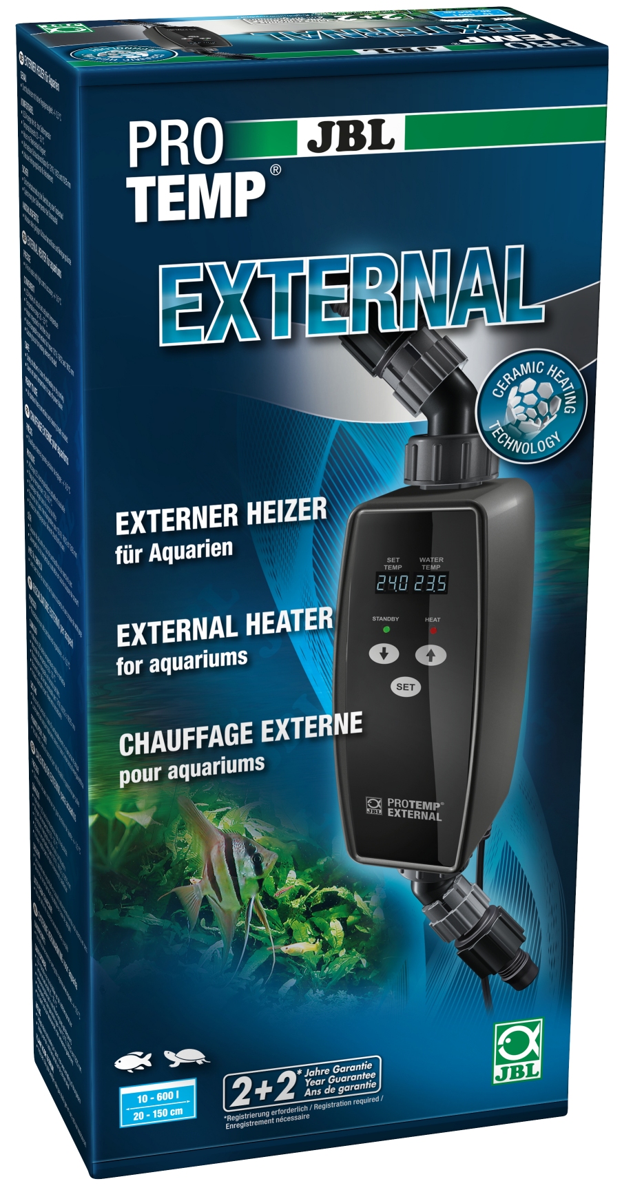 • The JBL ProTemp External is a powerful external flow-through aquarium heater that provides reliable and precise temperature control outside the tank. Installing it in the return hose of an external filter or circulation pump keeps the aquarium free of internal heating elements. This creates more space in the tank, improves its appearance and reduces the number of visible technical components.