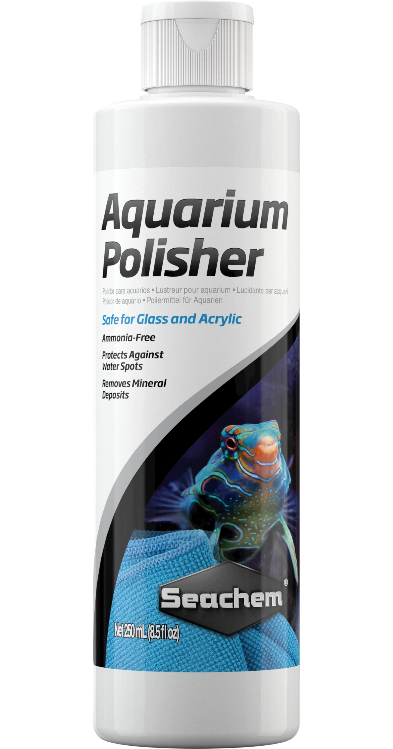 Seachem Aquarium Polisher is a multi-surface polishing solution designed for the exteriors of glass or acrylic aquariums and other smooth surfaces. It effectively removes water spots, mineral deposits, and builds a protective layer to guard surfaces against dust, fingerprints, salt, and further mineral buildup.