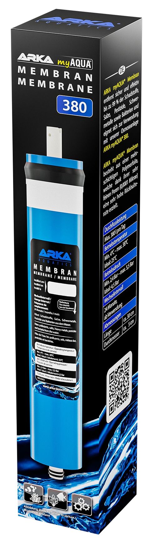 Arka myAQUA 380 Ersatzmembran für die Arka Osmoseanlage myAQUA 380. Die Arka myAQUA 380 Membran entfernt sicher und effektiv bis zu 99 % der Schadstoffe, Salze, Pestizide, Schwermetalle sowie Bakterien. Die Arka myAQUA 380 Membran besteht aus einem mit Polyester verstärkten Vliesstoff, welcher dank seiner sehr feinen Poren (0,0001 Mikron) eine sehr hohe Rückhalterate erzielt.