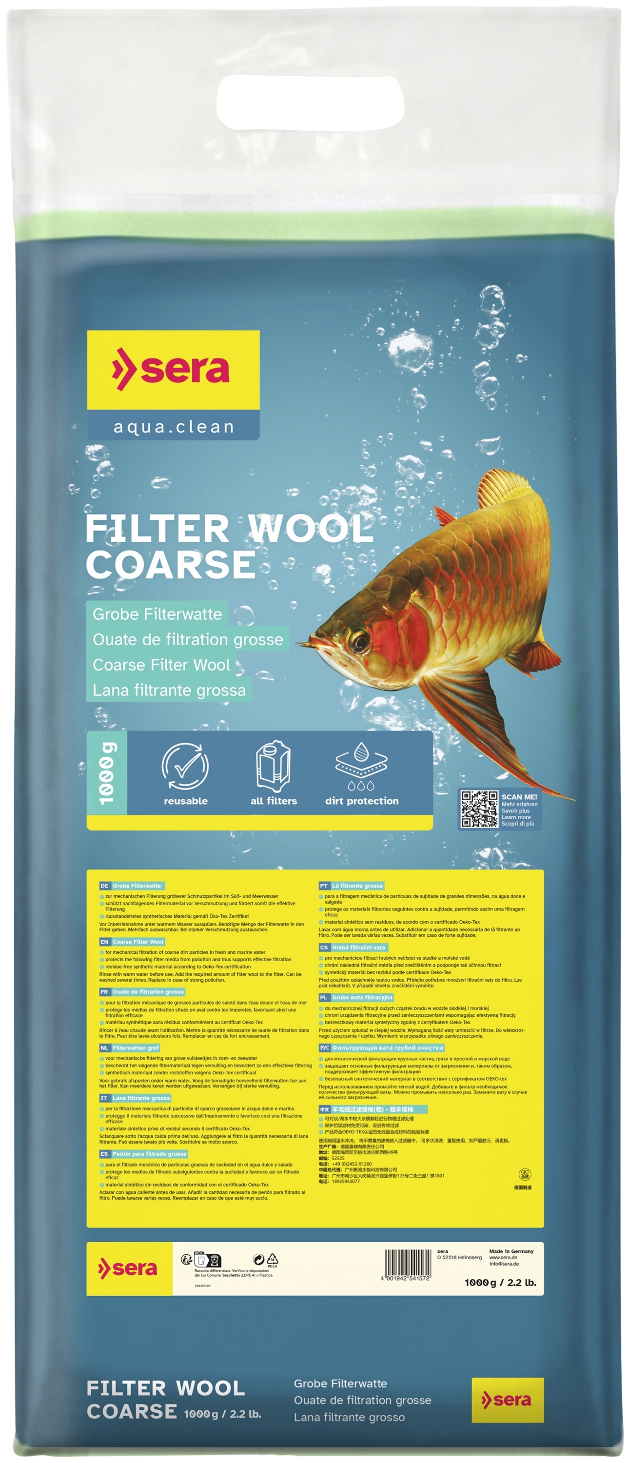 {"translations":[{"text":"A lã filtrante Sera é um meio filtrante universal para aquários de água doce e marinha. A lã filtrante Sera é adequada para filtros internos e externos e pode ser lavada várias vezes. A lã filtrante Sera é isenta de substâncias nocivas e não liberta quaisquer substâncias na água do aquário. Utilizada em camadas sobrepostas, a lã filtrante torna-se um filtro fino que filtra até as partículas suspensas mais pequenas da água do aquário.